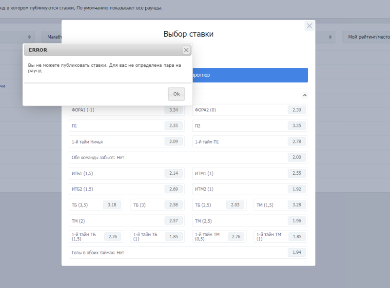Мне выдает ошибку при добавлении - Вы не можете публиковать ставки. Для вас не определена пара на раунд