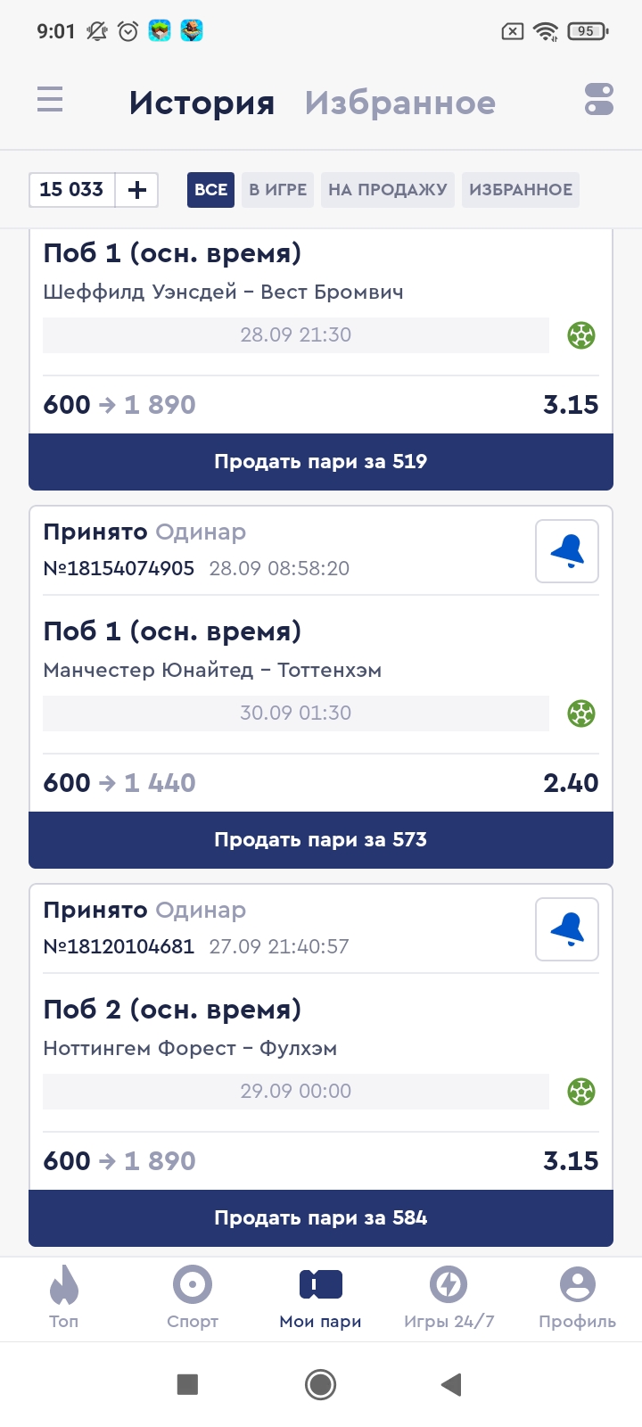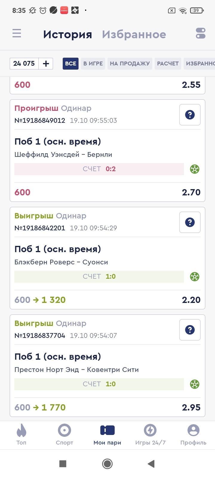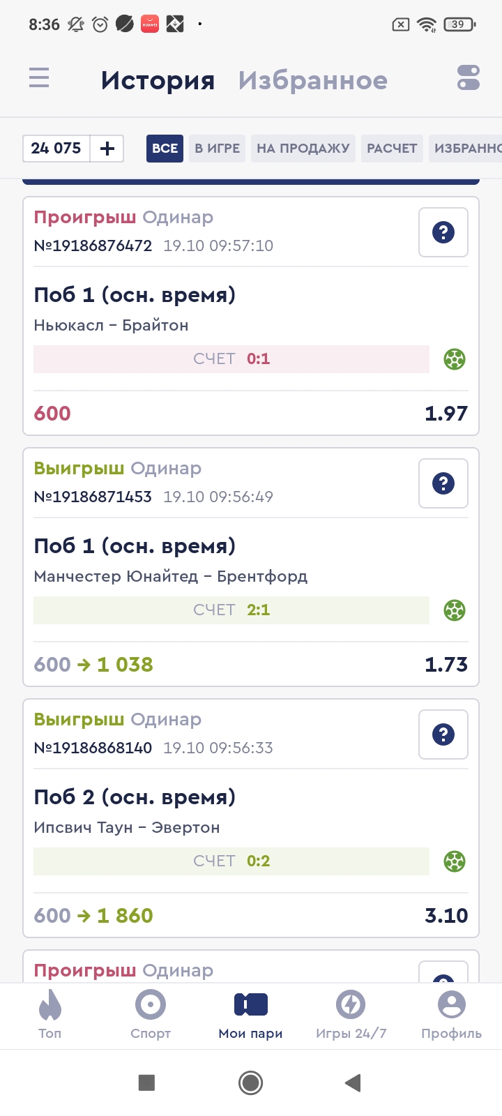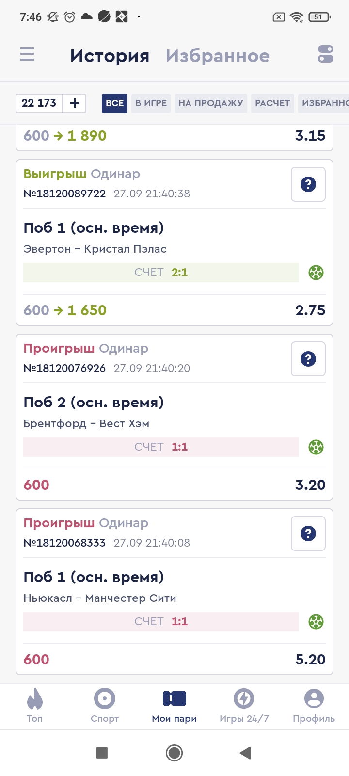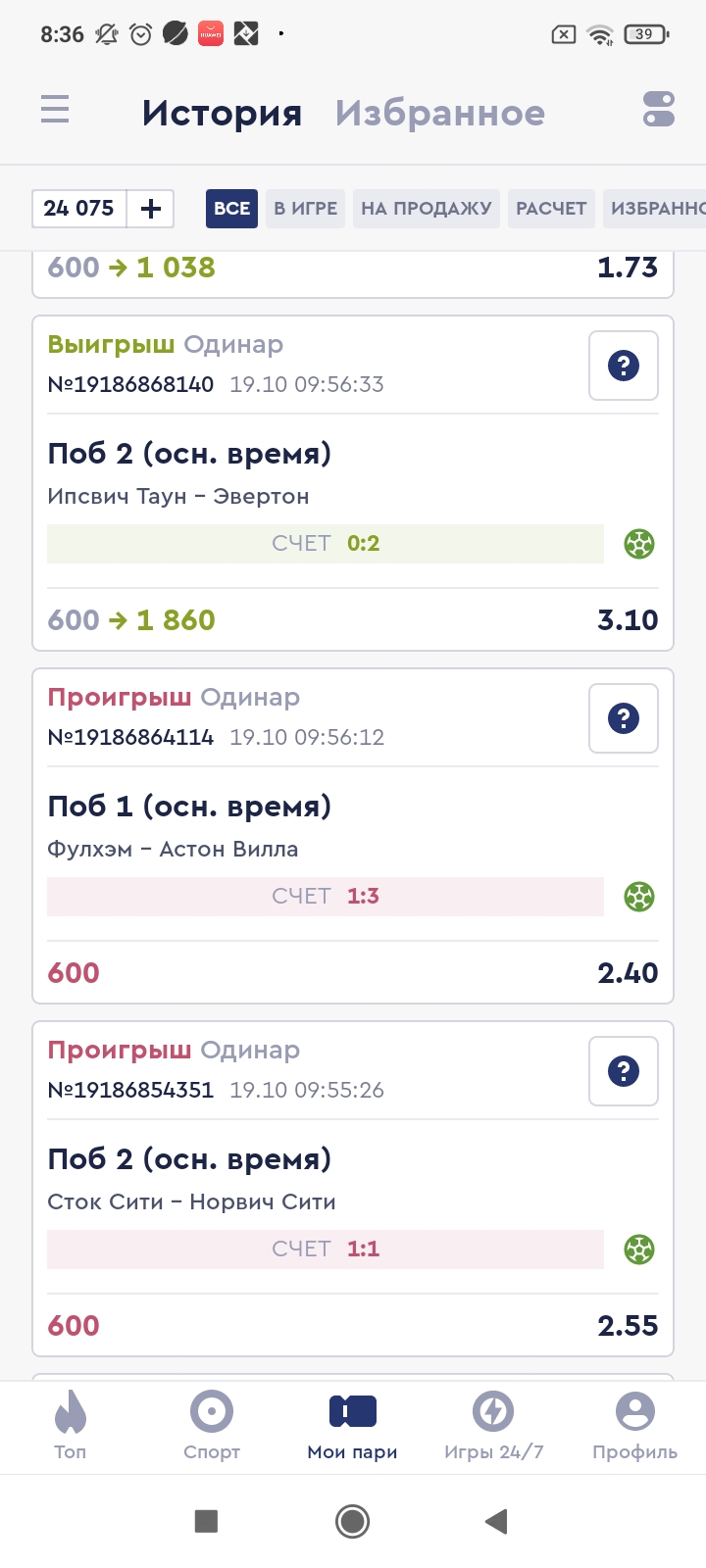 Сыграли две ставки, остальные мимо. Из обидного Саутгемптон- Ипсвич: на 95 ой минуте ипсвич сравнял счёт. В игре ставка на Ман Сити против Арсенала.