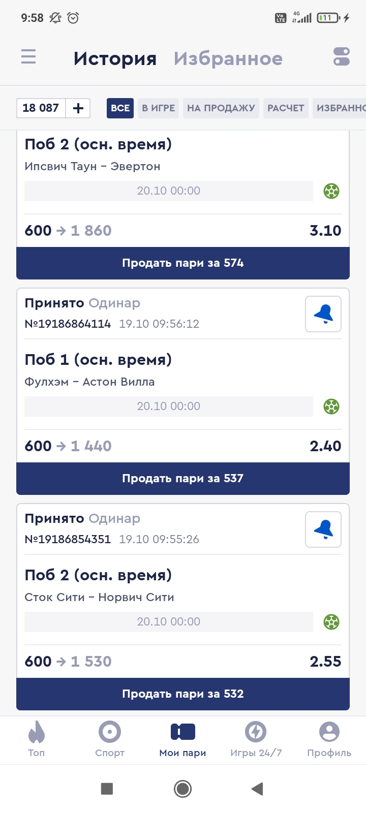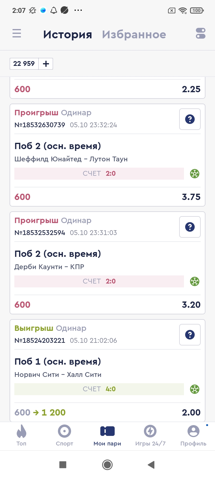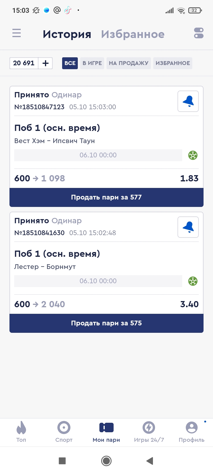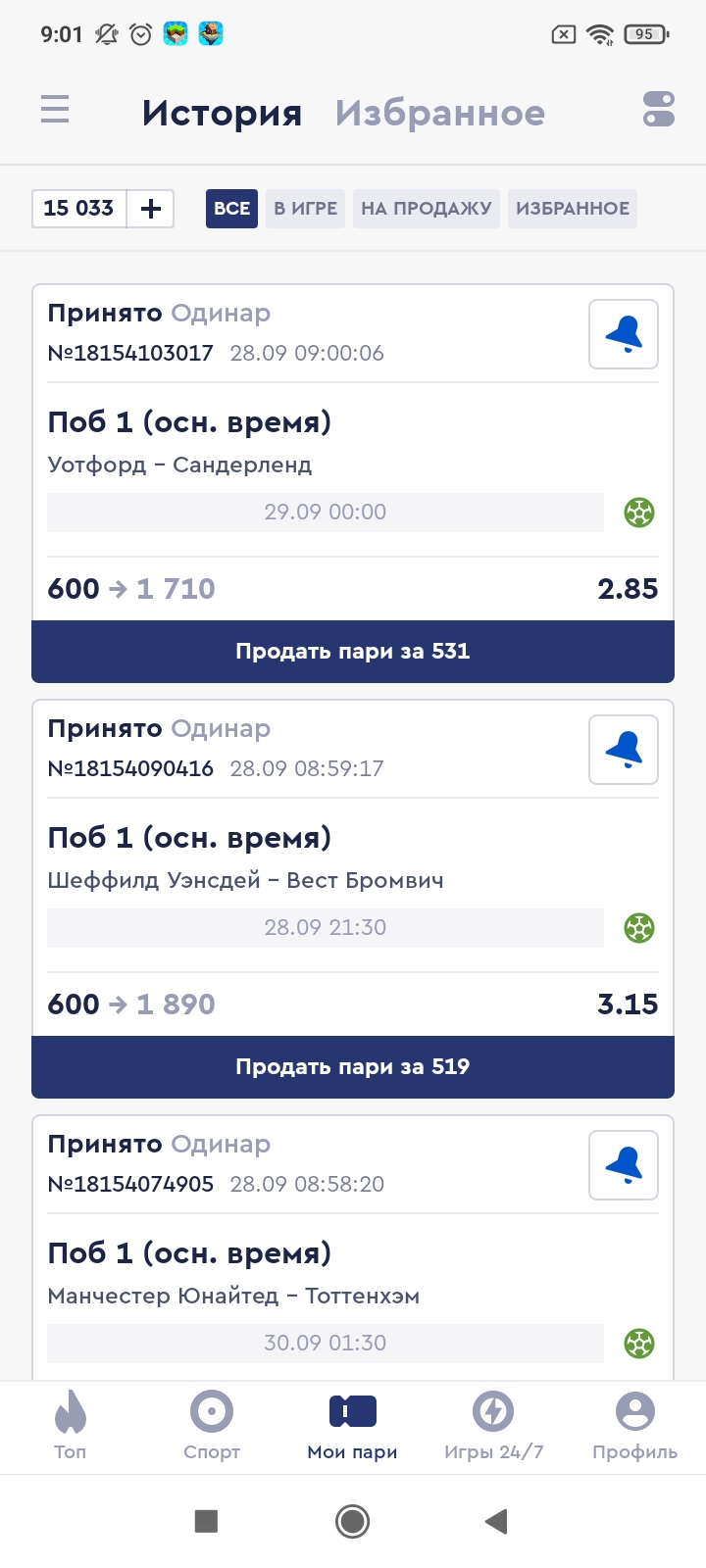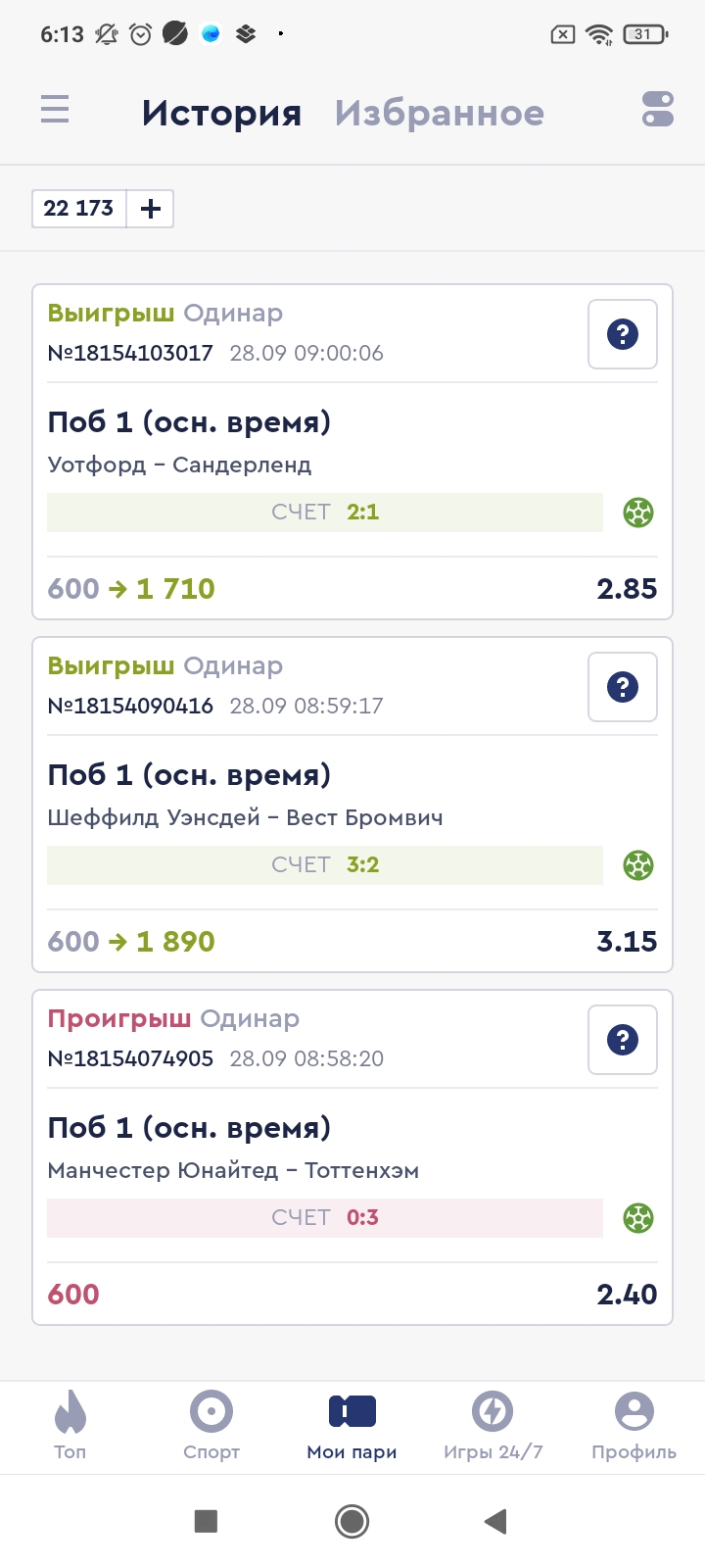 Сыграли две ставки, остальные мимо. Из обидного Саутгемптон- Ипсвич: на 95 ой минуте ипсвич сравнял счёт. В игре ставка на Ман Сити против Арсенала.