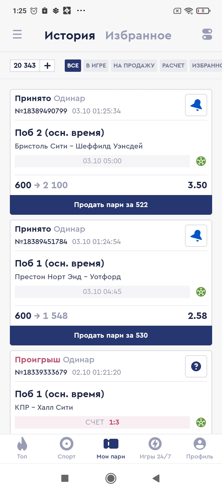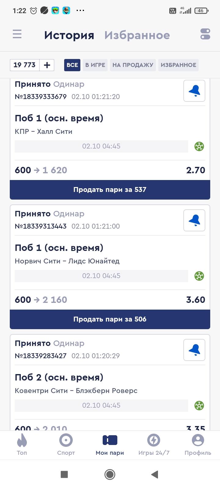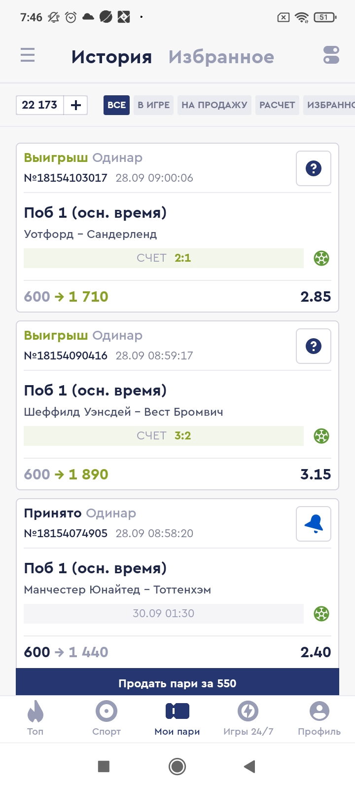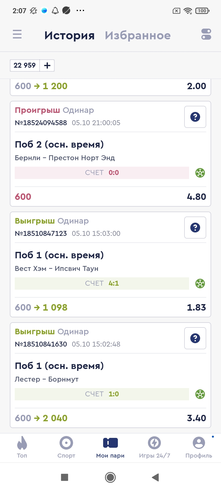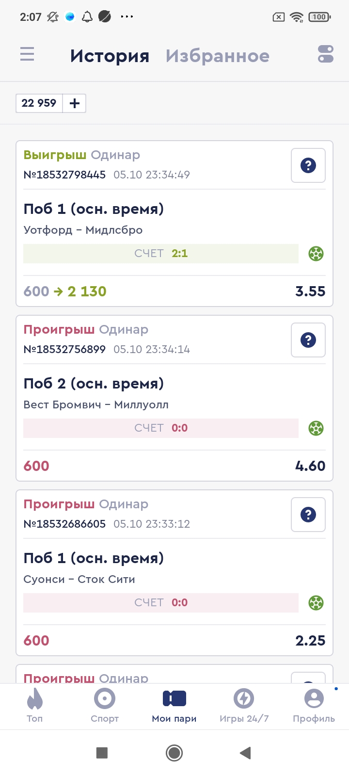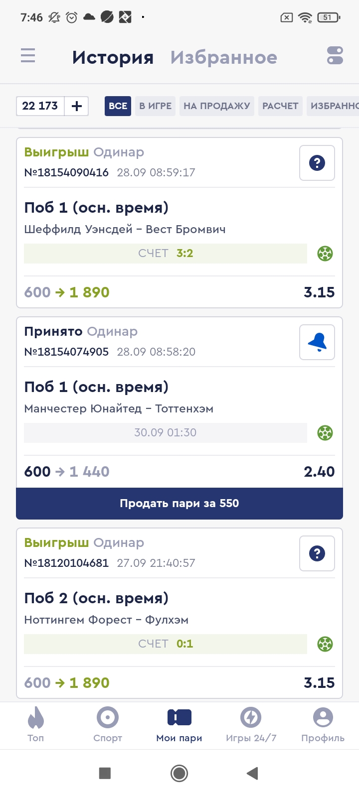 Сыграли две ставки, остальные мимо. Из обидного Саутгемптон- Ипсвич: на 95 ой минуте ипсвич сравнял счёт. В игре ставка на Ман Сити против Арсенала.