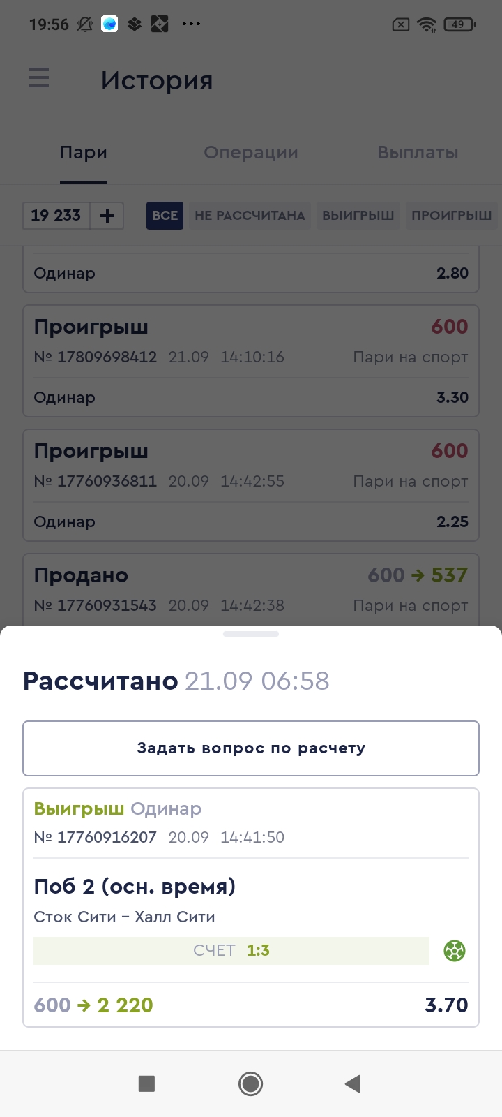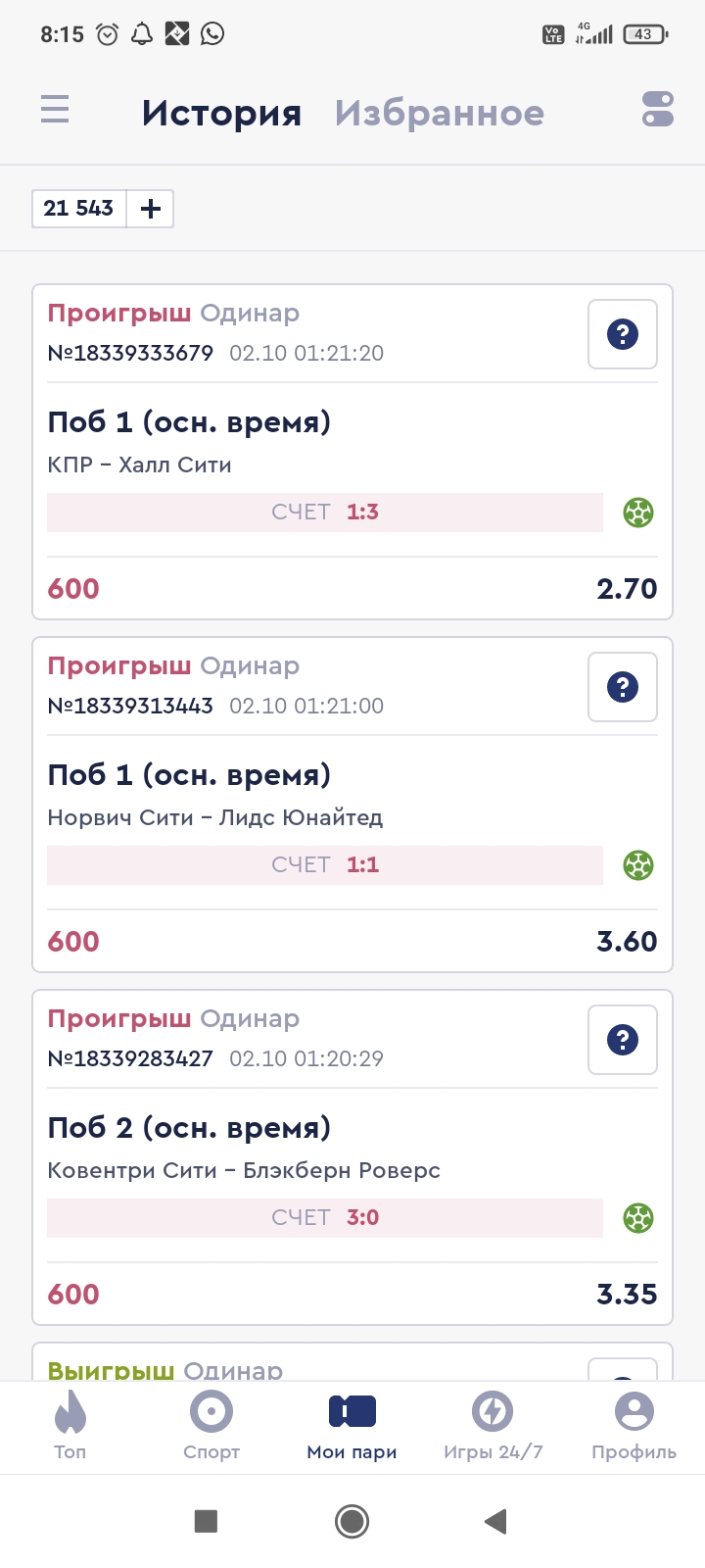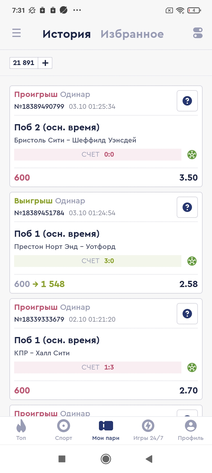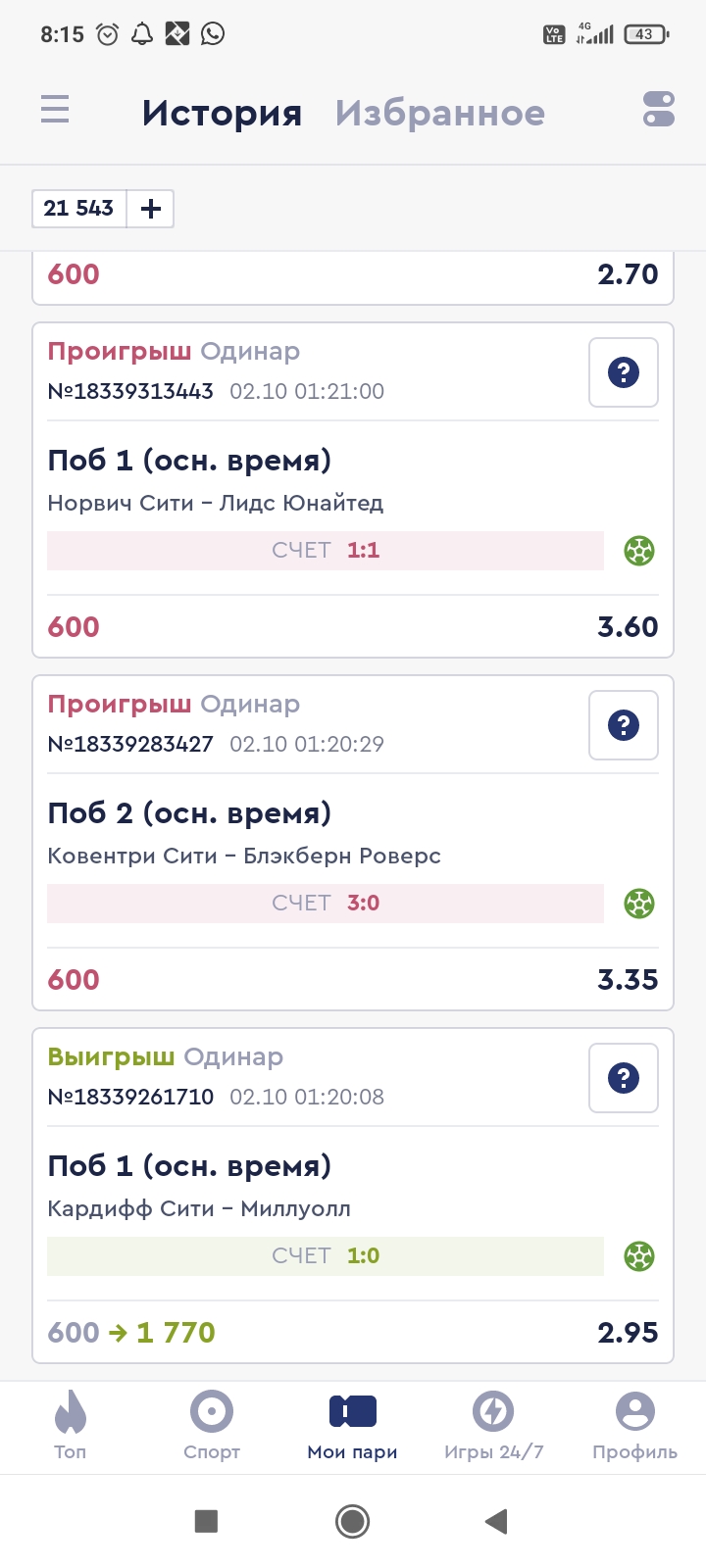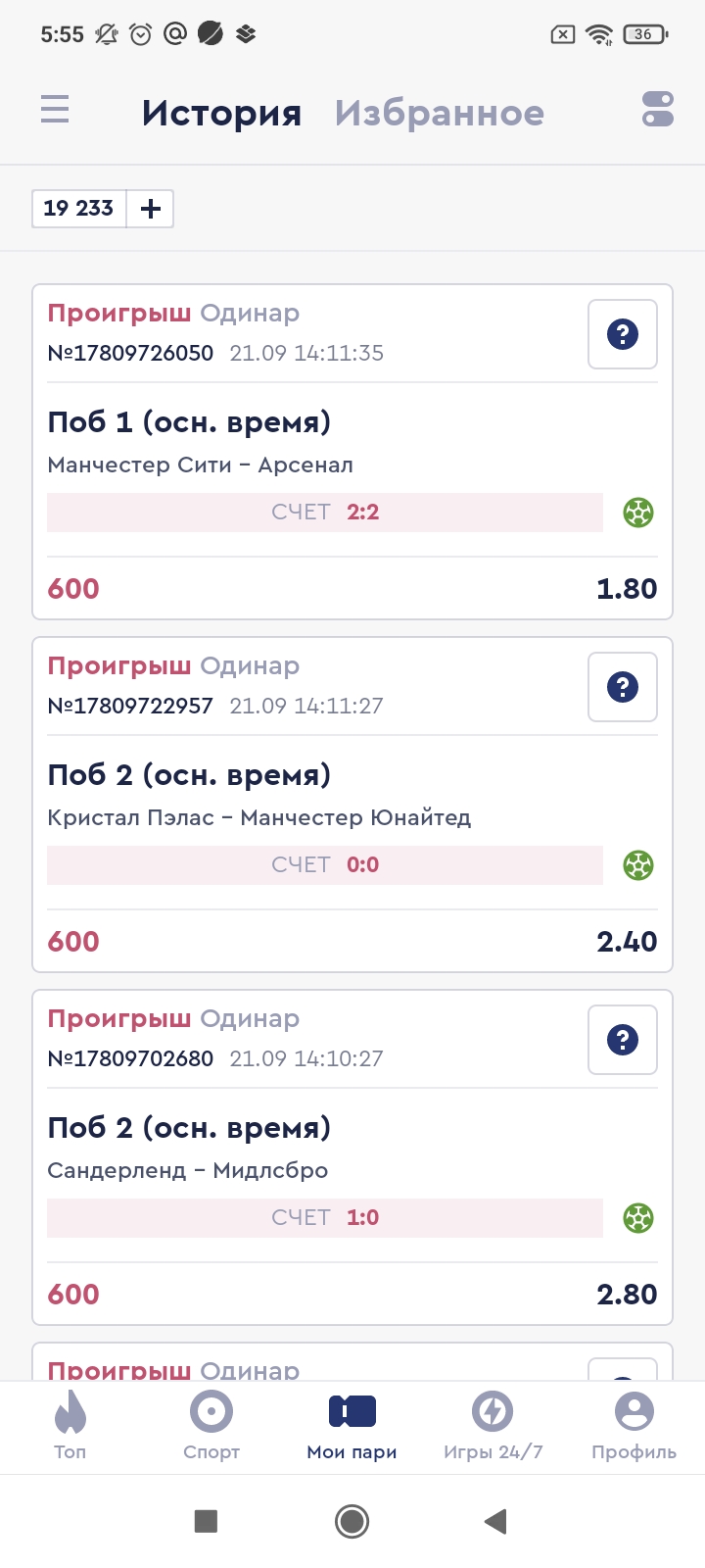 Сыграли две ставки, остальные мимо. Из обидного Саутгемптон- Ипсвич: на 95 ой минуте ипсвич сравнял счёт. В игре ставка на Ман Сити против Арсенала.