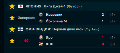 На ночь ничего не могу найти. Точнее есть один матч в Боливии,но там кэф совсем мелкий. Завтра утром посмотрю,на вечер вроде Финляндия будет. Посмотрел соседнюю тему с мошенником. Никого не хочу обманывать или ещё чего-то, по факту я свои прессы проставляю. Использую догон,но гибридный что-ли. Повышаю одновременно и кэф и сумму ставки. То есть беру 500 рублей и удваиваю. Если не идёт то беру 800 и ставлю до нужного исхода. Серии бывают до 8 - 10 выигрышных матчей. Минусовые бывают тоже (естественно). Но больше 3 шагом пока не было. Может фарт,может чуйка. Вчера например не взял Японию,хотя все показатели были более чем подходящие. Но вот заклинило не трогать этот матч и всё (матч не прошел кстати). Хз зачем это написал,но просто посчитал нужным. По поводу тем которые вёл раньше и забросил,прошу прощения ,но я просто периодически страдаю rasпиз@&&@@вом. Быстро загорелся и также потух. Эту тему постараюсь вести на регулярной основе. Всем добра и кэфоф побольше