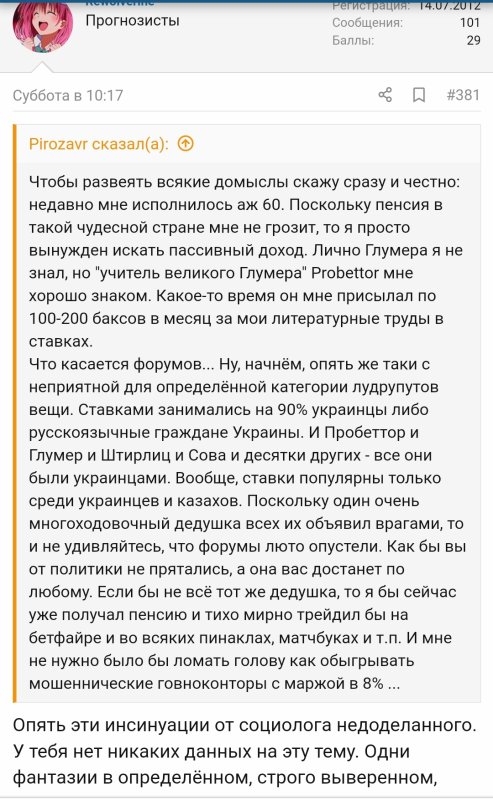 Дурика не включай))...я как минимум третий кого он решил описать по автарке...только с реальностью,его описание,не имеет ничего общего))...а когда я ему на это указал,то он да и ты тоже давай к фактам цепляться которые я озвучил...только к описанию по аватарке не имеет никакого отношения....строчит тут пустые тексты,что то пытается выдавить из себя умное...но пока кромеТак ты ж сам просил дать описание о себе по аватаркеПросил - получи