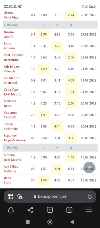 Кто подскажет...есть ли сервис на подобие betexplorer которые показывает результаты с КФ по турам ...типо такого что на скрине...про оддспортал,флешскоре бетэксплорер не говорите ..что то другое есть?...заранее спасибо.