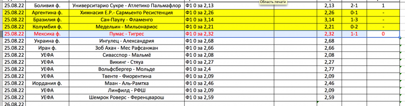 | 25.08.22 | Мексика ф. | Пумас - Тигрес | Ф1 0 за 2,32 | 2,32 | |