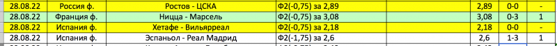 | 28.08.22 | Россия ф. | Ростов - ЦСКА | Ф2(-0,75) за 2,89 | 2,89 | |