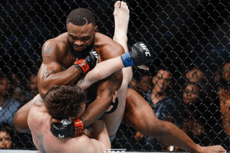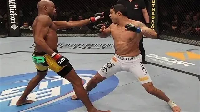 успешно переводит оппонента в центре октагона, но получить преимущество не удалось, т.к. на контратаке DenisDenial15 провел хороший удар в челюсть - 1:1!