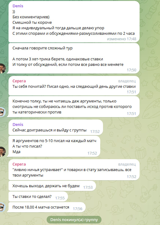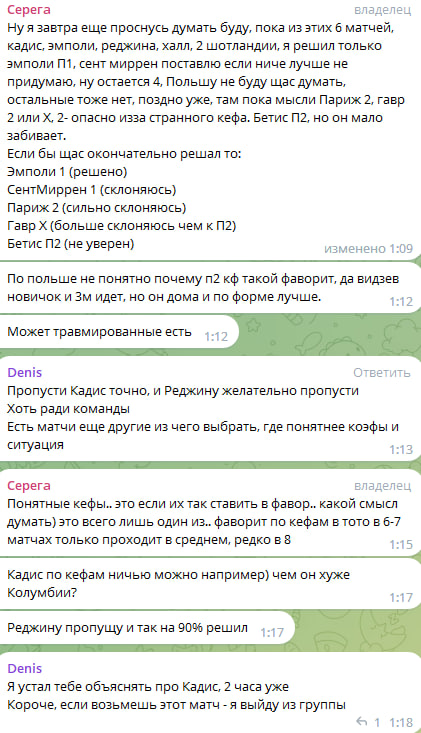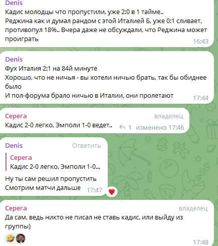 У меня нет переписки с той группы обсуждения ЧМ в Телеграме, так что ты заархивируй переписку, выложи тут, и пусть все увидят, если тебе не слабо. Я написал 3 матча, в которых я Вас спас (где Вы вдвоем были против моего мнения, а я был прав), и таких матчей было явно больше, минимум 5-10.