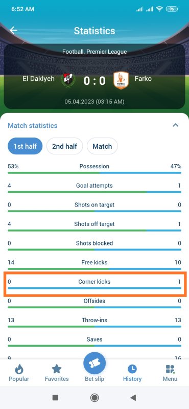 Матч "Дахлия - Фарко" по flashscore в 1-м тайме закончился со счётом 0-1 (угловые).