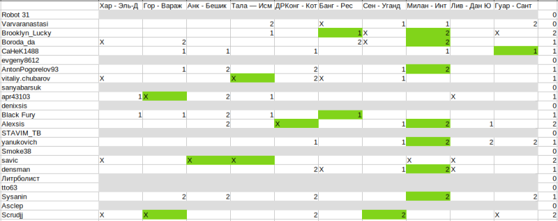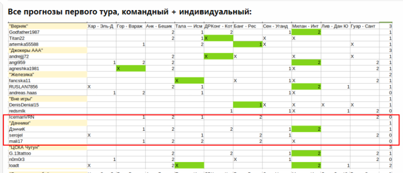 Меня нет с Миланом) или тут не полностью таблицаВсе прогнозы первого тура, индивидуальный: